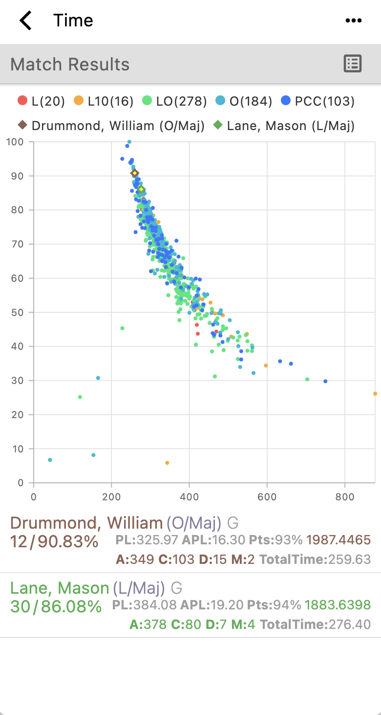 Competitor’s raw time is plotted on the X axis and Y axis shows their match or stage standing %