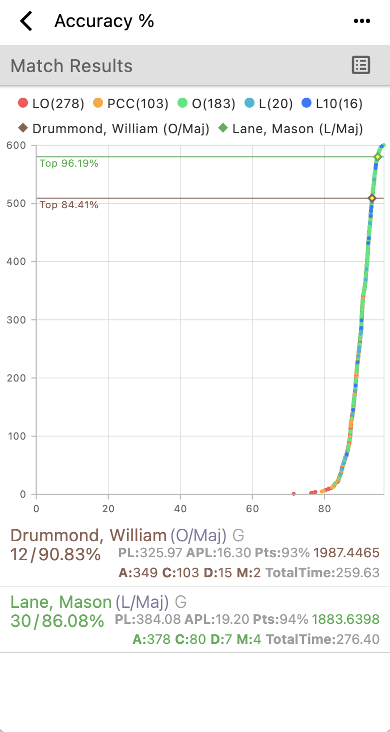 Competitor’s final time is plotted on the X axis and chart shows the percentile of selected competitor’s points - Match or stage accuracy % (HF, ICORE scoring)