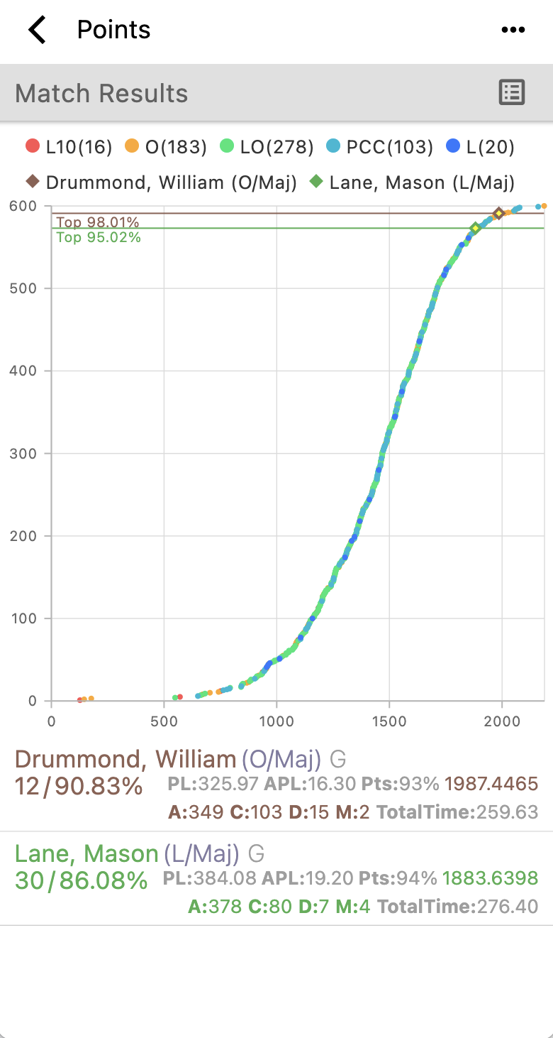 Competitor’s points is plotted on the X axis and chart shows the percentile of selected competitor’s points - Match or stage final time *(IDPA and TimePlus scoring)
